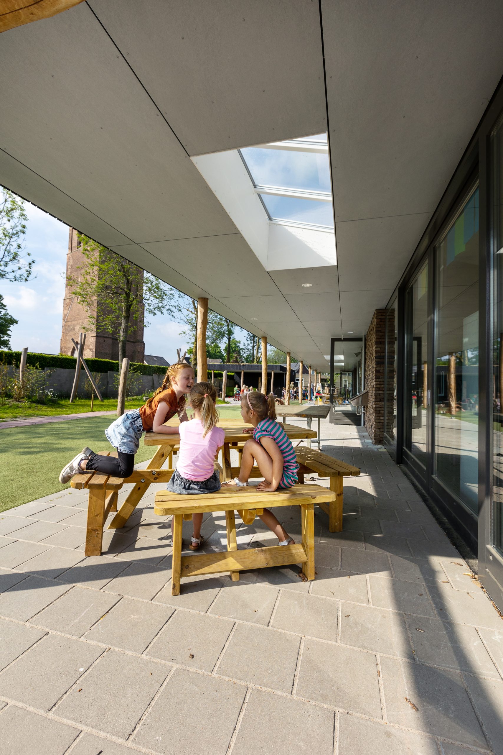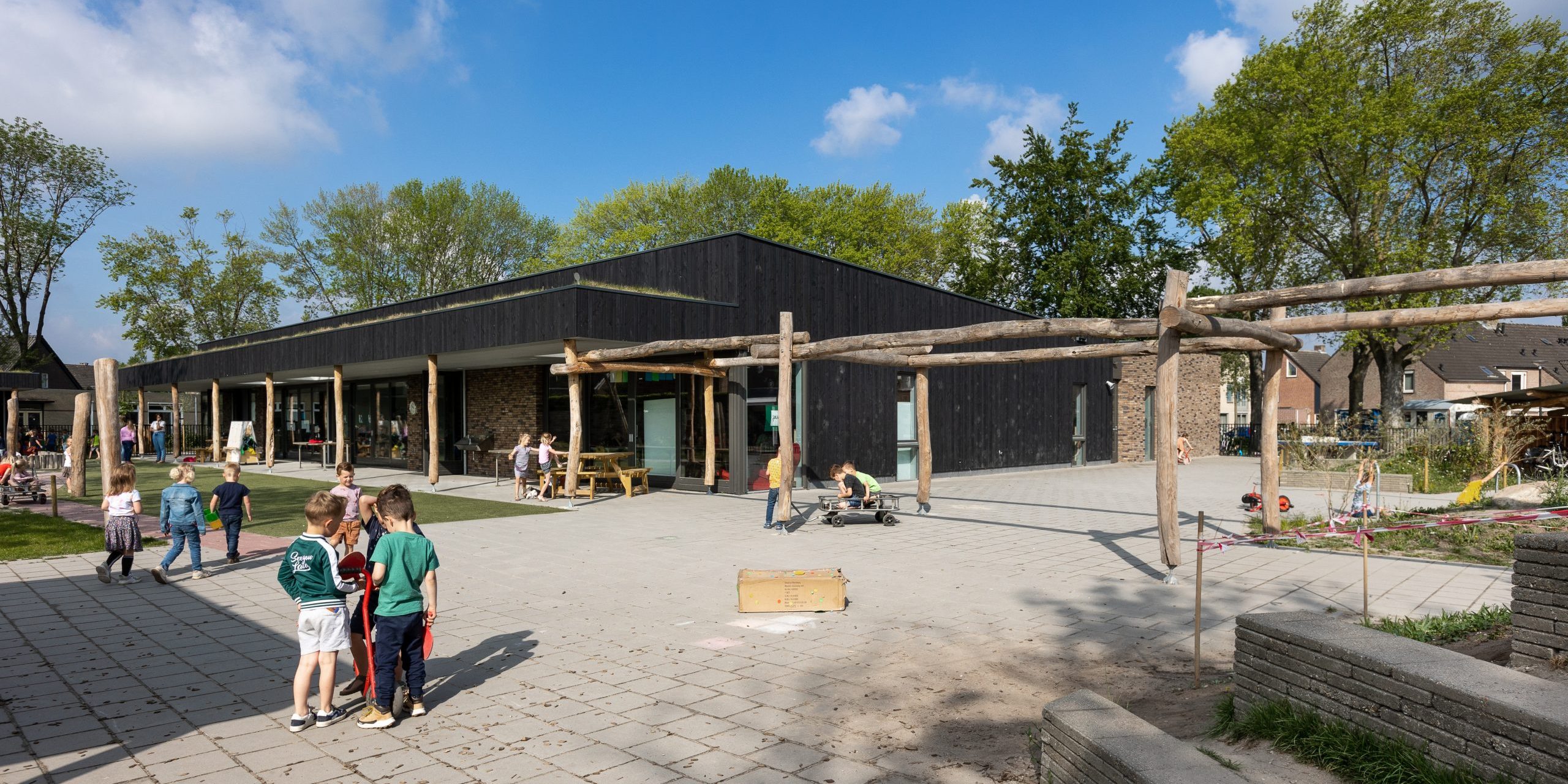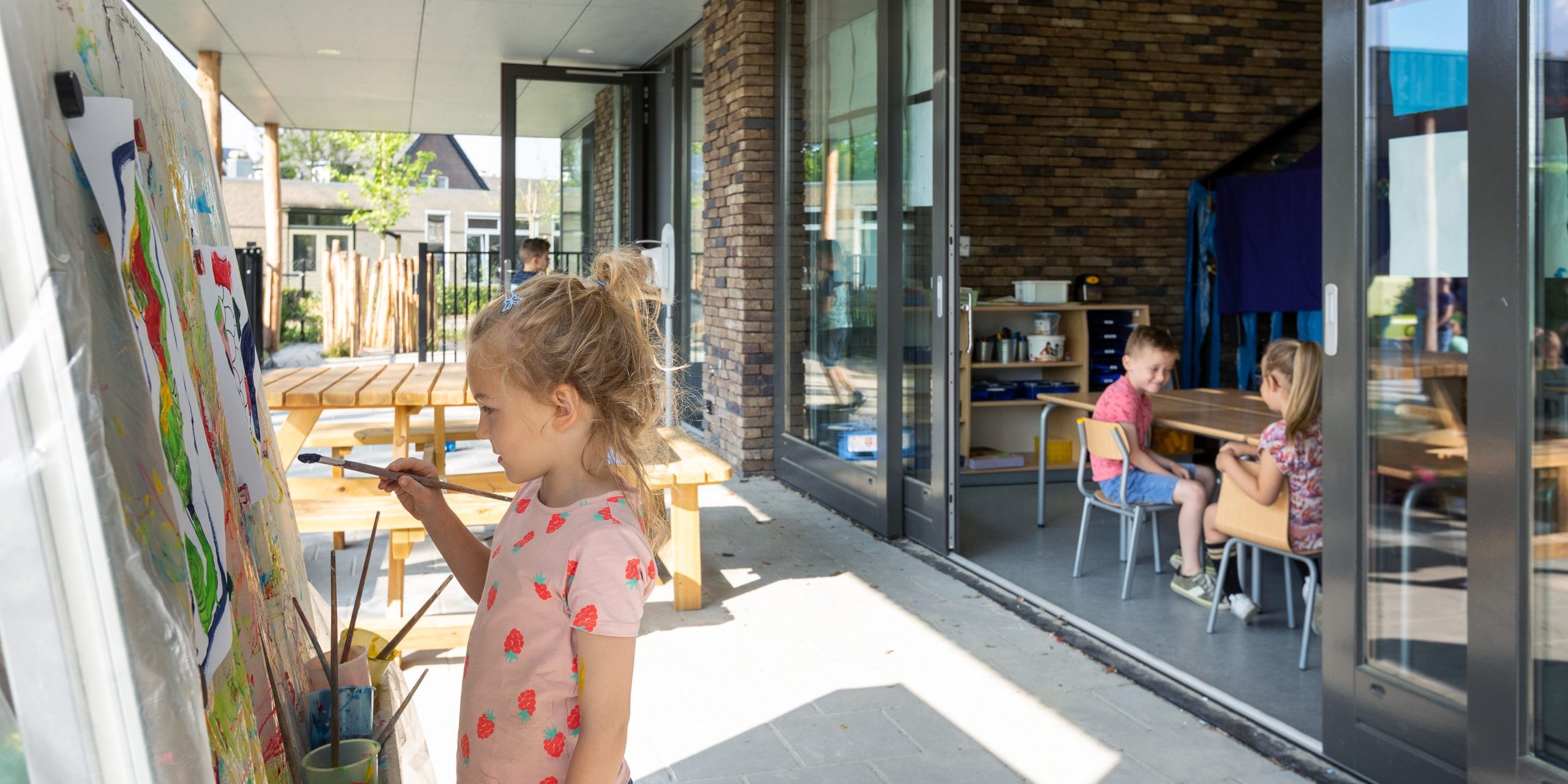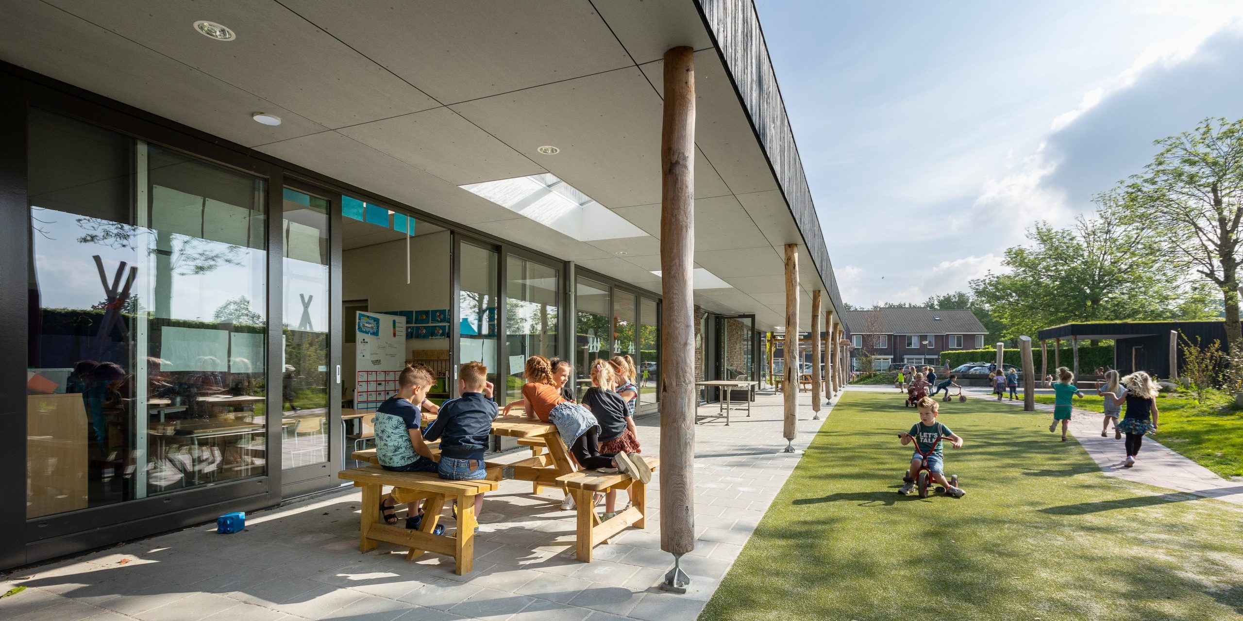 De uitnodigende en natuurlijke buitenomgeving is een belangrijke schakel daarin. Leerlingen kunnen straks vanuit hun onderwijsruimte direct naar buiten naar het groen ingerichte schoolplein. Tegen de gevel biedt een brede luifel de nodige beschutting. De buitenkant van het gebouw is met hout bekleed om daarmee de verbinding met de natuur te bevestigen. Een duurzame leeromgeving waarin kinderen zich optimaal kunnen ontwikkelen.