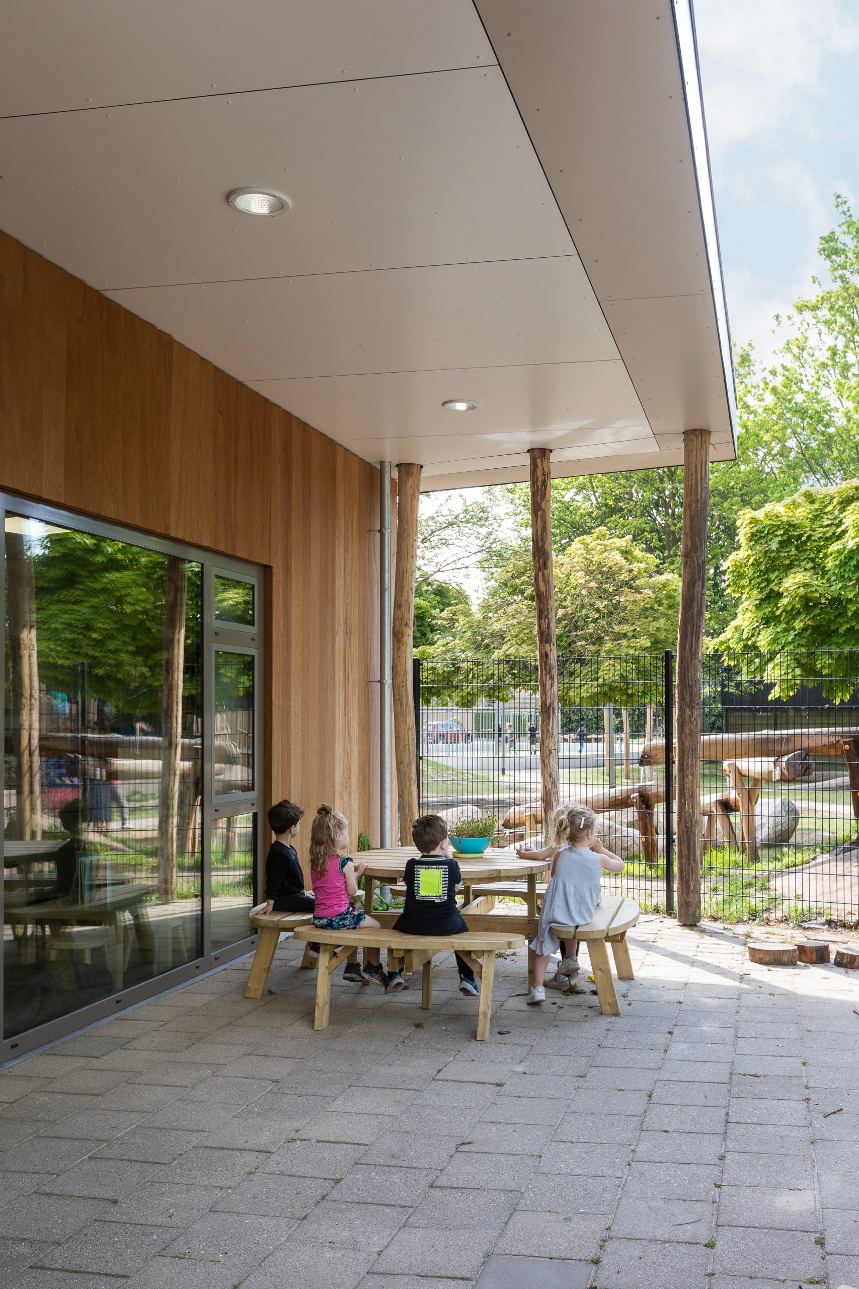 Het gebouw is dankzij een integraal ontwerptraject echt onderdeel ván het park geworden. Het omringende educatiepark staat in directe verbinding met het onderwijsgebouw en is zo onderdeel van de leeromgeving. Het is een plek geworden waar onderwijsactiviteiten en wijkbewoners elkaar kruisen. De groen ingerichte buitenruimte nodigt haar gebruikers uit om te leren in en over de natuur.
