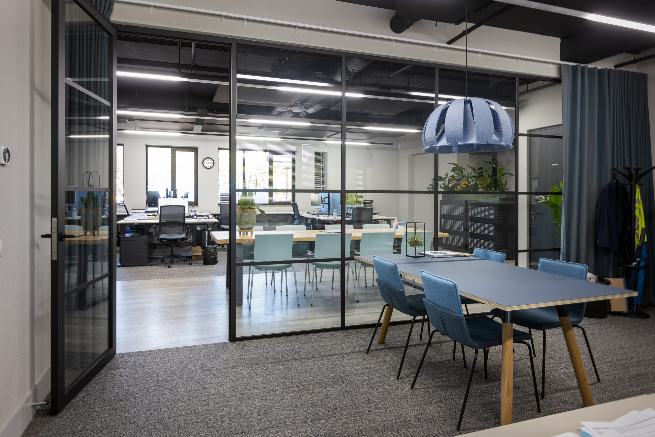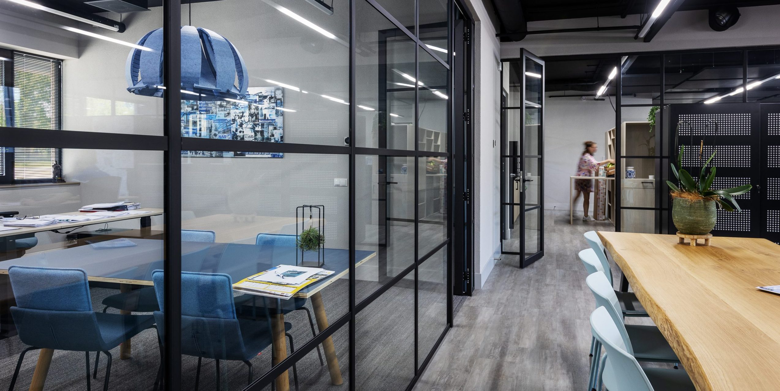 Het interieur weerspiegelt de warme sfeer die past bij dit familiebedrijf. Een warme en vertrouwde omgeving. De bedrijfskleur wordt doorgevoerd in het meubilair, op de wanden en komt terug als detail in het tapijt. Dankzij het vele interieur-groen, houtaccenten en de keuze voor natuurlijke boomstamtafels voelen de ruimtes stuk voor stuk vertrouwd aan.