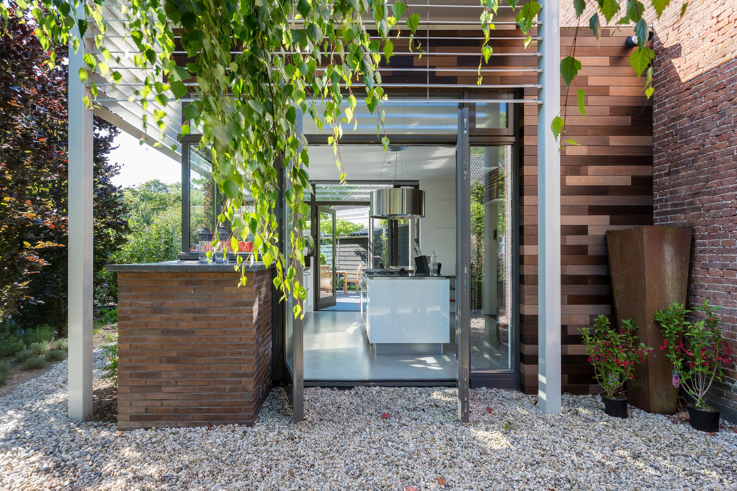 Aan een klassiek woonhuis van eind 1800 ontwierpen we een ruimtelijke en zonnige uitbouw. Bijzonder is de situering tegen de blinde kopgevel van de woning, waardoor in de nieuwe situatie de prachtige tuin ten volle genoten kan worden. De grens tussen binnen en buiten wordt geminimaliseerd door een ruimtelijke opzet waardoor het weldadige groen optimaal beleefd kan worden. Bovendien voorziet een stalen frame in de zonwering. Dat maakt dit ontwerp expressief en eigentijds.