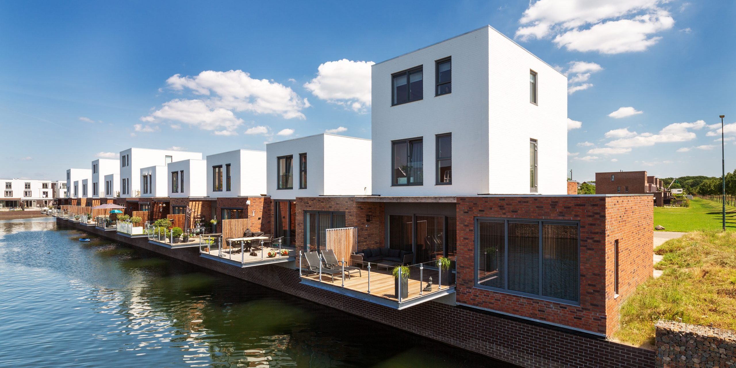 Aan het Horreum in Cuijk zijn 11 unieke waterwoningen gerealiseerd. Op de prachtige locatie aan het water komt het ontwerp geheel tot zijn recht.